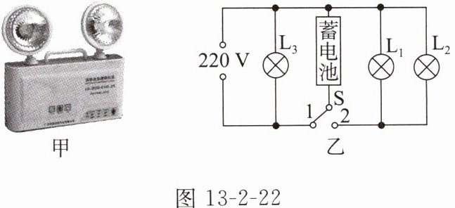 7. 一款消防应急照明灯如图13-2-22甲所示,图13-2-22乙是简化原理图,有两只应急灯泡$L_1、$$L_2,$当外部电源供电时,自动开关S接1,两只应急灯不亮,指示灯$L_3$与蓄电池是