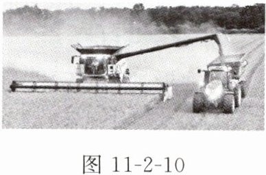 10. 如图11-2-10所示,装载车和收割机以$2m/s$的速度同向做匀速直线运动,收割机每分钟将$50kg$粮食装载到车上,随着所装粮食的增加,装载车的功率也会变大。装载车空载时质量为$5×10^{3}kg$,车受到的牵引力为车所受总重力的$\frac{1}{5}$。$g取10N/kg$,收割开始时车为空载状态,设装载车始终在水平地面上,不计空气阻力。