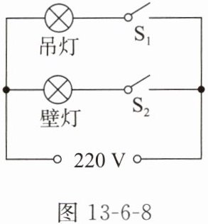 4. 小明在他的房间安装了一盏吊灯和一盏壁灯,吊灯和壁灯的电路连接如图 13 - 6 - 8 所示,下列说法正确的是(