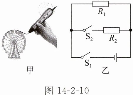 $ \Omega $。9. 一款 3D 打印笔(图 14 - 2 - 10 甲)具有立体绘画功能。通电后,打印笔内电阻丝发热使笔内绘画材料熔化,加热电路简化后如图 14 - 2 - 10 乙所示,电源电压恒为 $ 6 $ V,定值电阻 $ R_1 = 6 \Omega $,同时闭合开关 $ S_1 $ 和 $ S_2 $ 时,干路中的电流为 $ 2.5 $ A。求: