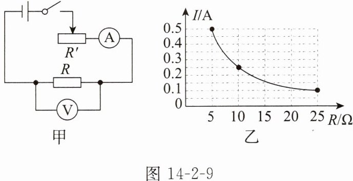 8. 图 14 - 2 - 9 甲是小伟探究导体中电流与电阻的关系的电路图。图 14 - 2 - 9 乙是他根据实验数据描绘出的 $ I - R $ 关系图像。由图像可知:当电压一定时,电流与电阻成