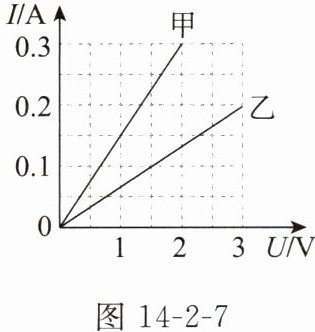 6. 甲、乙两电阻的电流与电压关系如图 14 - 2 - 7 所示,由图可知,通过同一电阻的电流与它两端的电压成