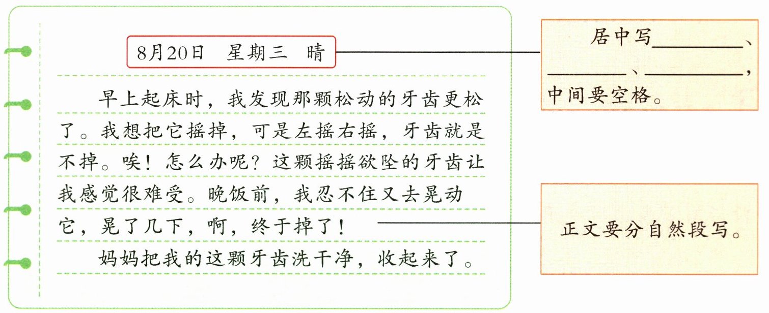 你最近有没有遇到有趣的事?有没有读过有意思的书?有没有遇到让自己印象深刻的人?想一想,在你的日记本里写下来,要注意日记的格式哦!