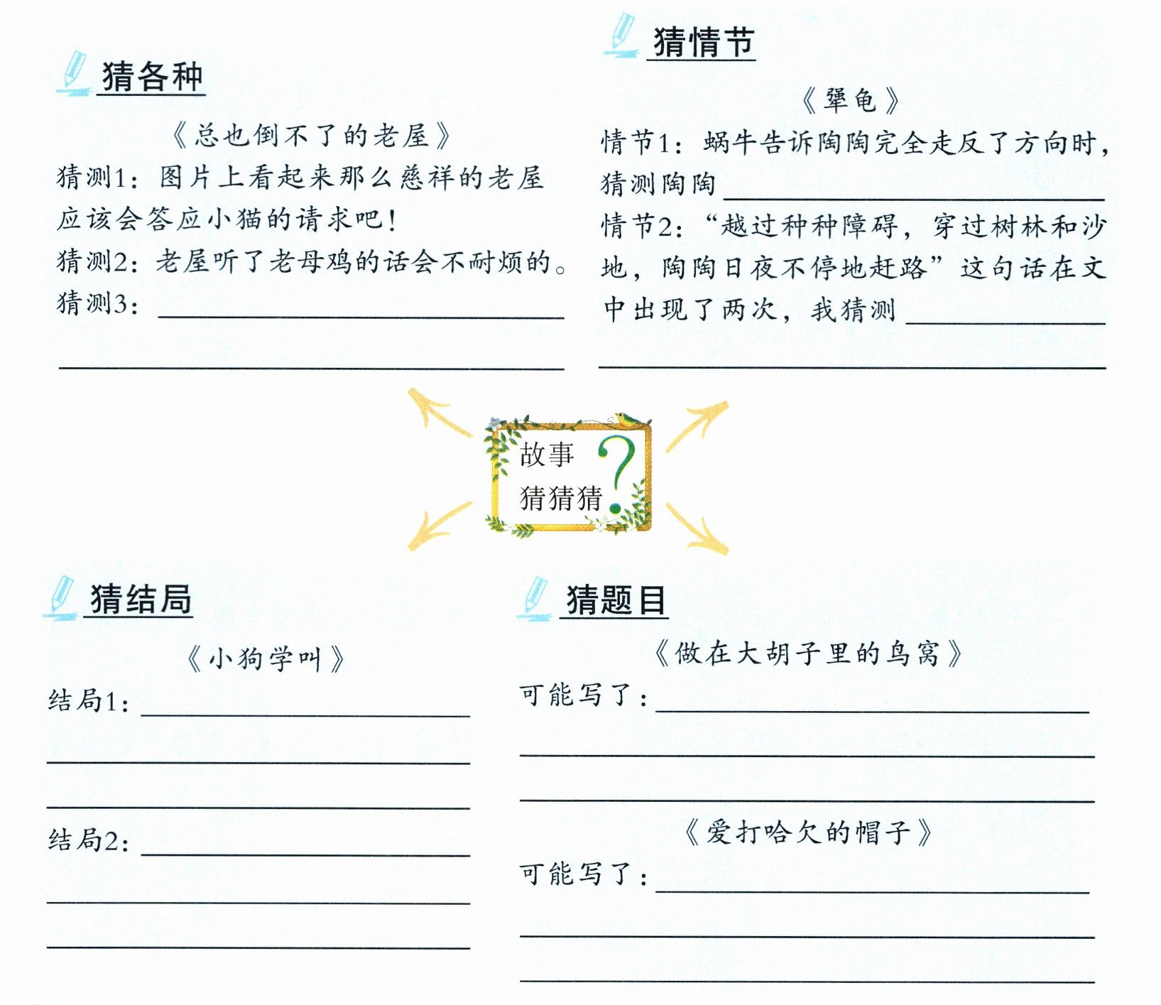 猜测3:(示例)老屋还未听完蜘蛛的故事就站不住,倒下了。 情节1:陶陶一定赶不上婚礼了。 情节2:后面可能还会出现很多障碍。 结局1:(示例)小狗遇见了狼,学会了“嗷……”,但它以为学会了狗叫。 结局2:(示例)小狗终于遇见了狗,但它以为是其他它不认识的动物,不愿做无用功的它,直接离开了。 可能写了:(示例)圣诞节,小鸟为了取暖在圣诞老人的胡子里做窝,随着圣诞老人走进千万家。(示例)因为帽子爱打哈欠,许多不同头围的人都无法把它戴牢,人们把戴牢这顶帽子作为了不起的挑战。