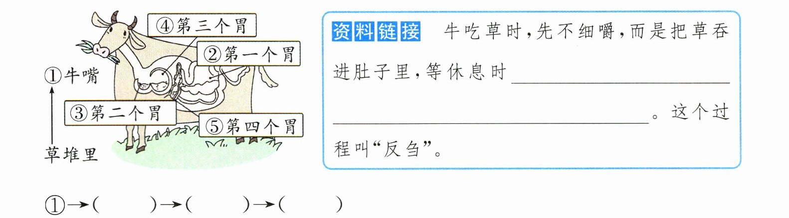 资料链接:反刍是指牛、羊等动物把粗粗咀嚼后咽下去的食物再返回到嘴里细细咀嚼,然后再咽下去。课文中红头随着草一起移动到牛的胃里,又从牛的胃里回到嘴里,就是因为牛在进行反刍。牛的这种行为是为了