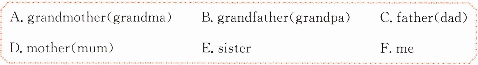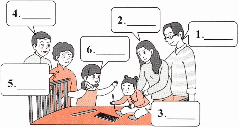 三、根据图片情景,给 Chen Jie 及其家人选择对应的单词,将序号写在相应的横线上。