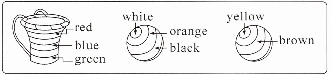 二、竹铃球是土家族人民喜爱的一项民族传统体育项目。重庆市某校的同学们正准备给编好的竹铃球和背筐涂上美丽的颜色。请你根据提示,帮助他们涂色。