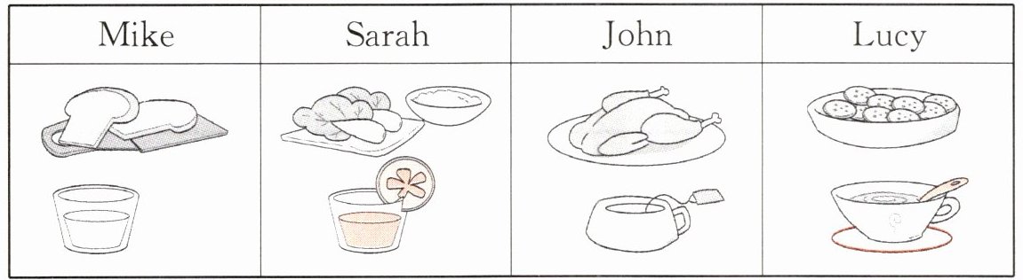 —What would you like to eat,Sarah? —Rice and vegetables, please.—What would you like to drink?—I'd like some orange juice.