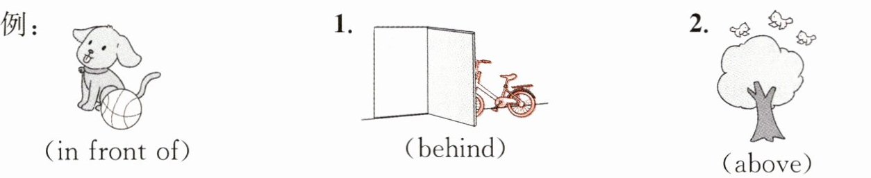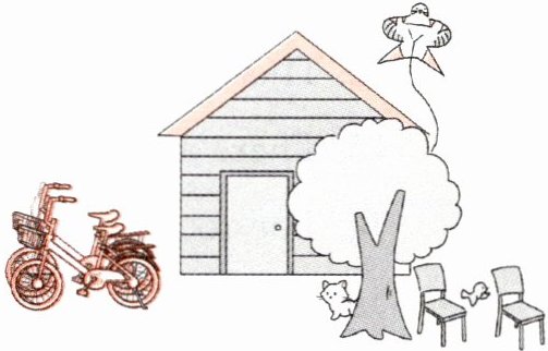1. —Where is the bike? —It's behind the door. 2. —Where are the birds? —They are above the tree.