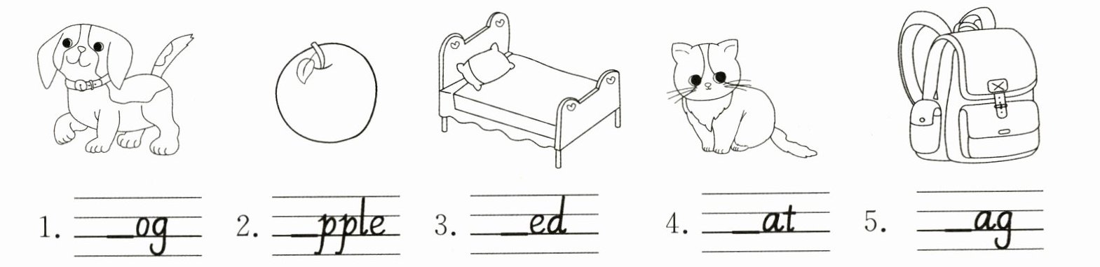 1. dog 2. apple 3. bed 4. cat 5. bag