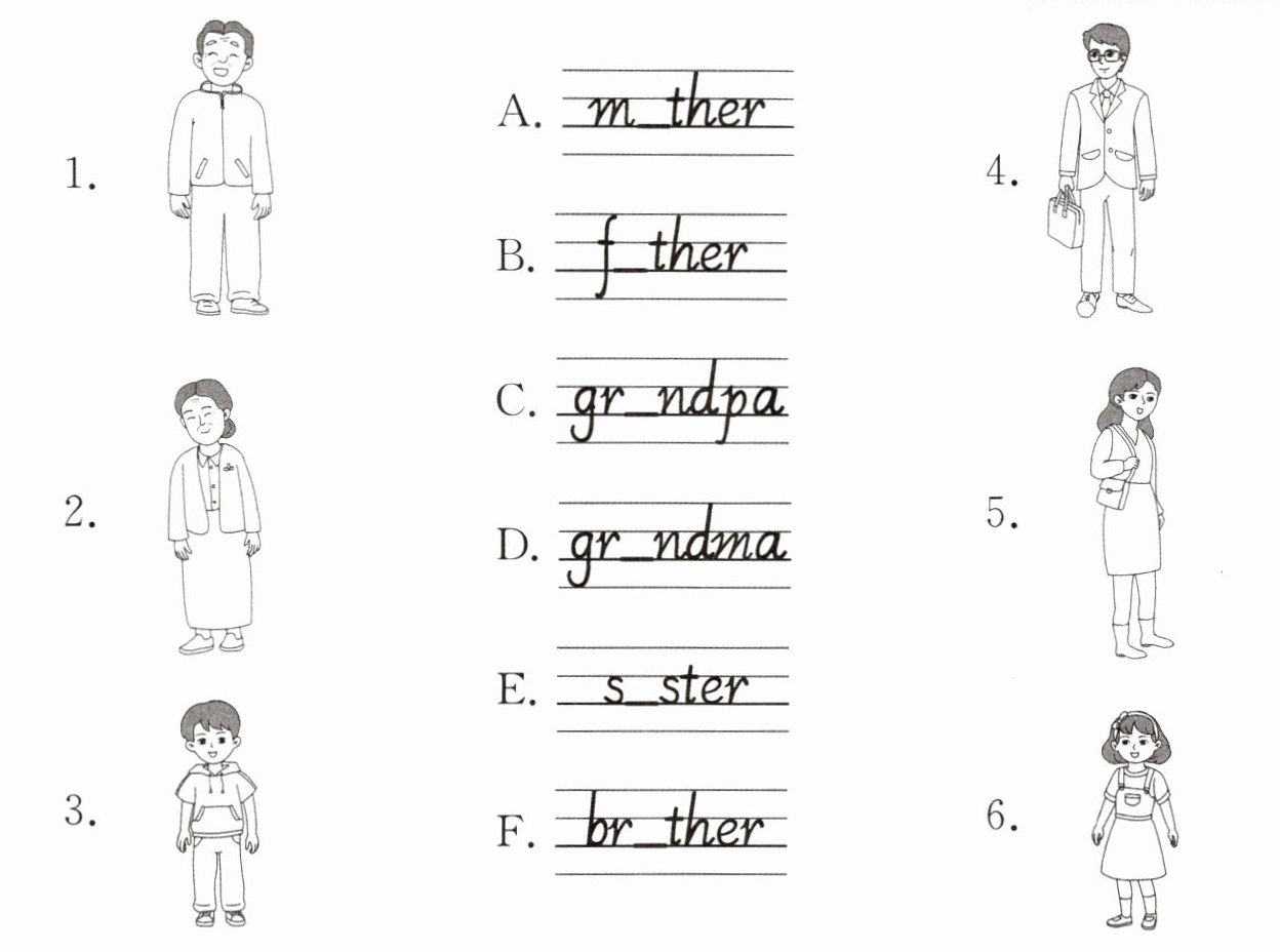 1—C;grandpa 2—D;grandma 3—F;brother 4—B;father 5—A;mother 6—E;sister