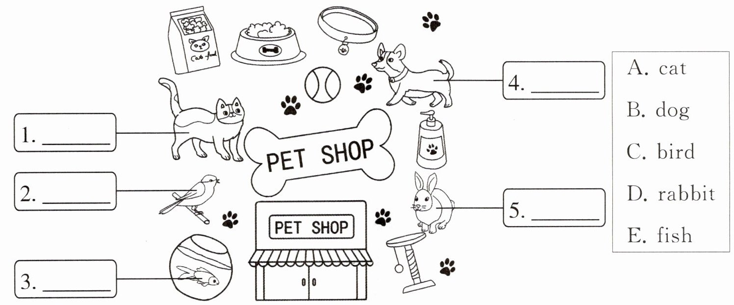 1. dog 2. cat 3. bird 4. rabbit 5. fish