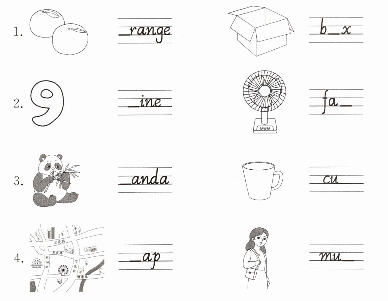 1. orange; box 2. nine; fan 3. panda; cup 4. map; mum