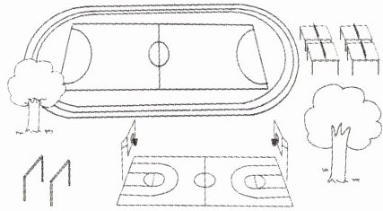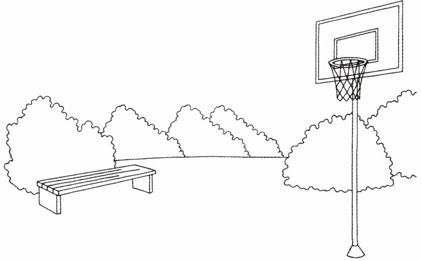 1. 在操场(playground)区域添加一个男孩,他正在打篮球。在篮球架下方绘制一个男孩,手持篮球,并做出投篮动作。