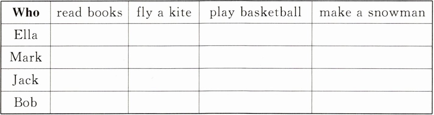 | Who | read books | fly a kite | play basketball | make a snowman |