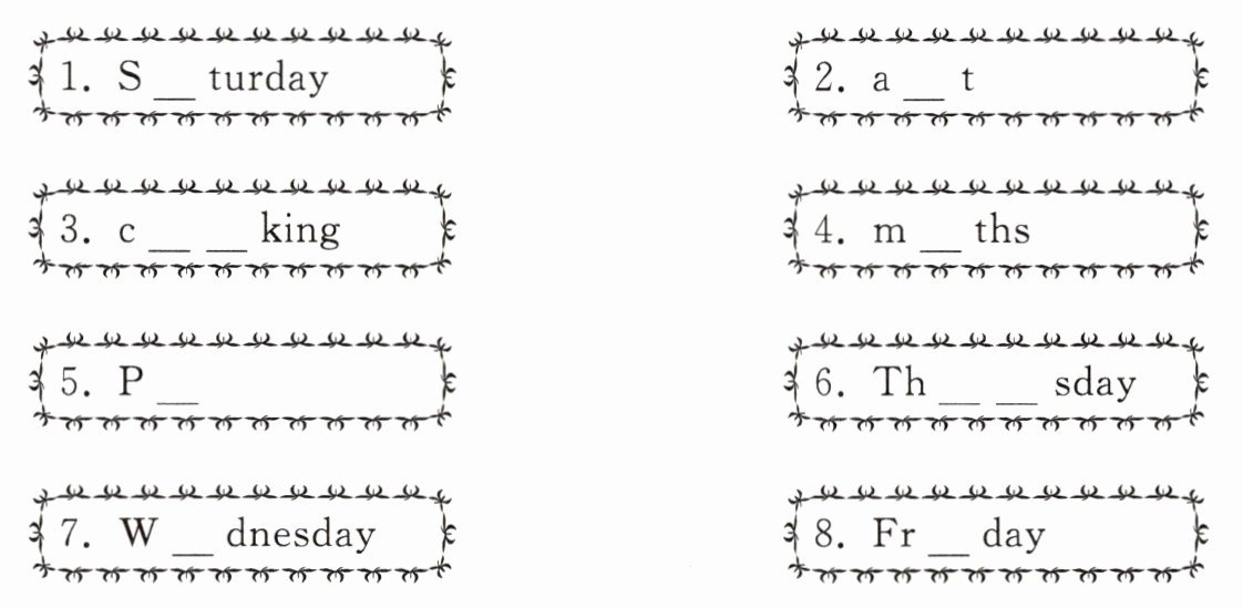 1. Saturday 2. art 3. cooking 4. maths 5. PE 6. Thursday 7. Wednesday 8. Friday