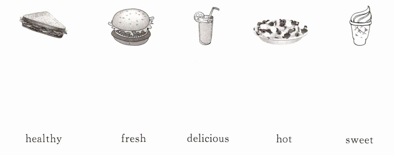 delicious;hot;fresh;healthy;sweet 对应的连线答案依次为第三(delicious 对应三明治连接正确选项)、第一(hot 对应汉堡选择连接表述中对应选项)、 第二(fresh对应饮料在选项位置)、 第四(healthy对应沙拉在选项位置)、 第五(sweet对应冰淇淋在选项位置) (以常见五连线对应选项从左到右排序答案为C A B D E 之类形式,本题以描述对应连线在选项顺序下答案为)C A B D E (一般此类题选项为从左到右对应连线选项顺序)