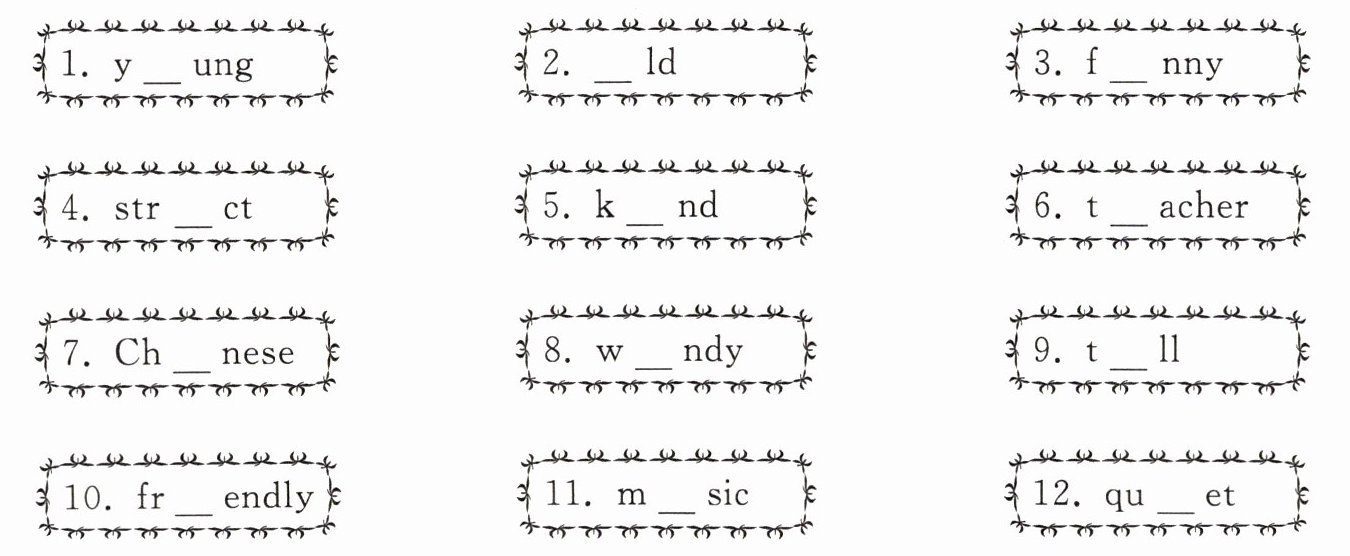1. young 2. old 3. funny 4. strict 5. kind 6. teacher 7. Chinese 8. windy 9. tall 10. friendly 11. music 12. quiet