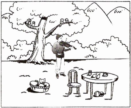 Look at this picture. The boy is Ben. He is under a big tree. What can you see in the tree? There are some birds. There is a table in the picture. You can see two pears 1. ______ the table. There are two balls 2. ______ the table. The chair is 3. ______ the table. Can you see a cat? Yes,it's 4. ______ the basket.