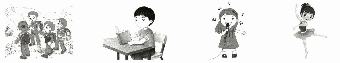 1. hiking (B) 2. studying (D) 3. singing (C) 4. dancing (A)