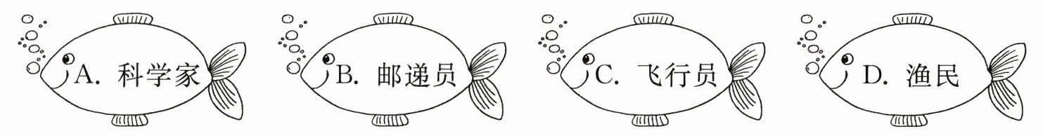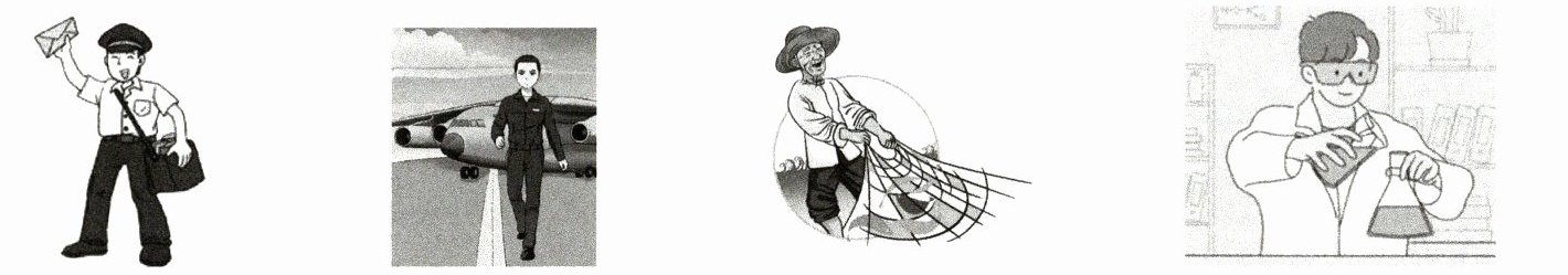 1. postman (B) 2. pilot (C) 3. fisherman (D) 4. scientist (A)
