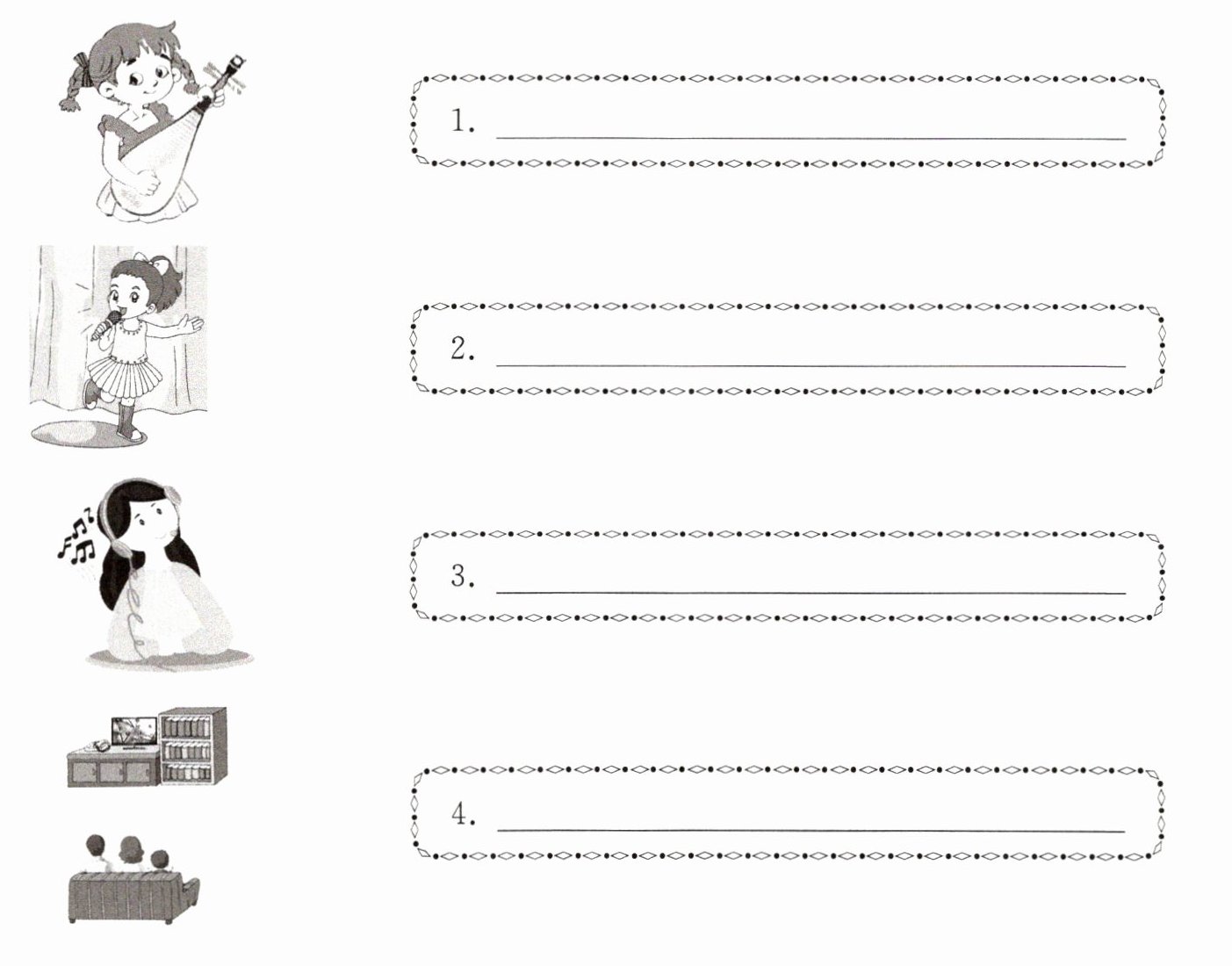1. She likes playing the pipa. 2. She likes singing. 3. She likes listening to music. 4. They like watching TV.