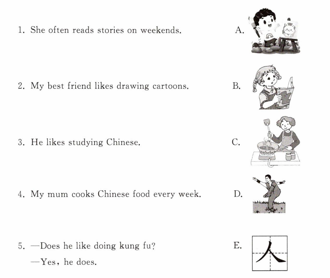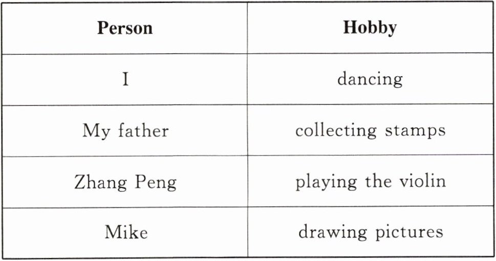 1. My father likes collecting stamps. 2. Zhang Peng likes playing the violin. 3. Mike likes drawing pictures.