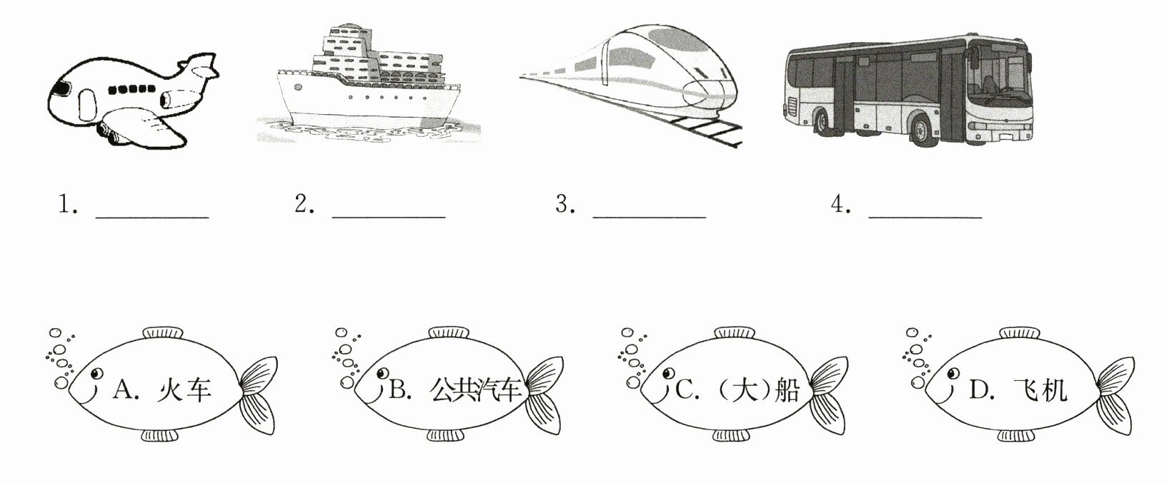 1. plane (D) 2. ship (C) 3. train (A) 4. bus (B)