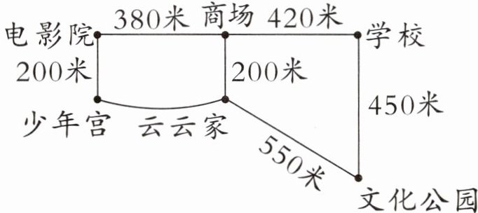 少年宫⇌电影院⇌商场⇌学校:200+380+420=1000(米) 云云家⇌文化公园⇌学校:550+450=1000(米) 涂色略