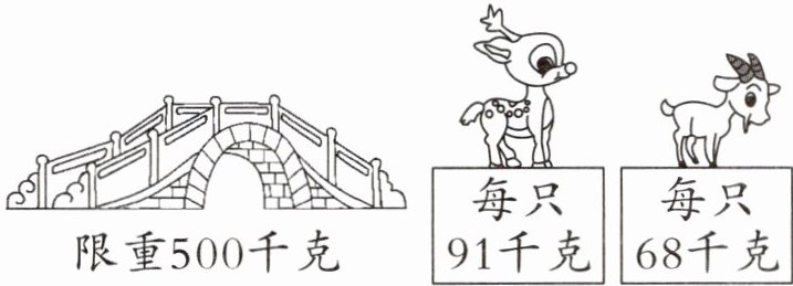 把91看成90,90×6=540(千克),540>500,所以6只小鹿不能同时过桥。把68看成70,70×7=490(千克),490<500,所以7只山羊能同时过桥。