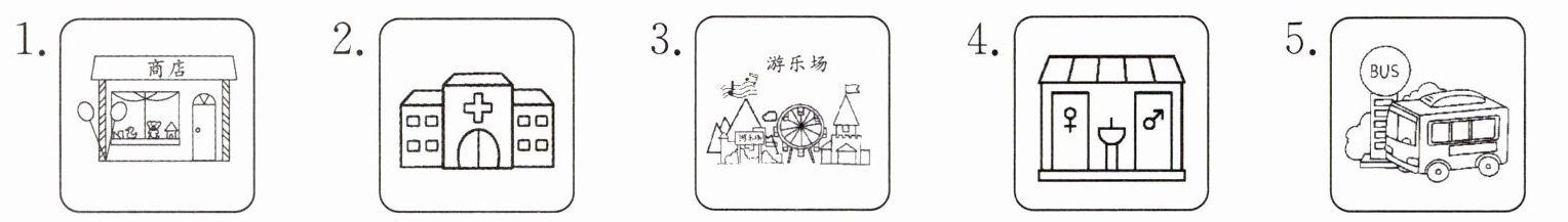 1. shop 2. hospital 3. playground 4. toilet 5. bus stop