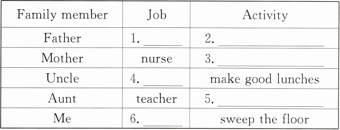 (护士). We often 6. ______clean