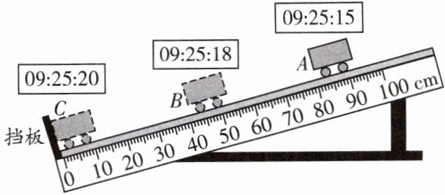 3. 如图所示是“测量小车的平均速度”的实验装置。实验时让小车从斜面的 $ A $ 点由静止滑下,分别测出小车到达 $ B $ 点和 $ C $ 点的时间,即可求出不同段的平均速度。