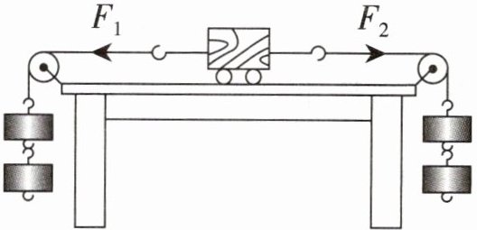 6. 如图所示,在“探究二力平衡的条件”实验中,小车置于水平桌面上,两端的轻质细绳绕过定滑轮挂有等重钩码。$F_1$是小车受到的向左的拉力$,F_2$是小车受到的向右的拉力$,F_1$与$F_2$在同一水平直线上。下列说法不正确的是(