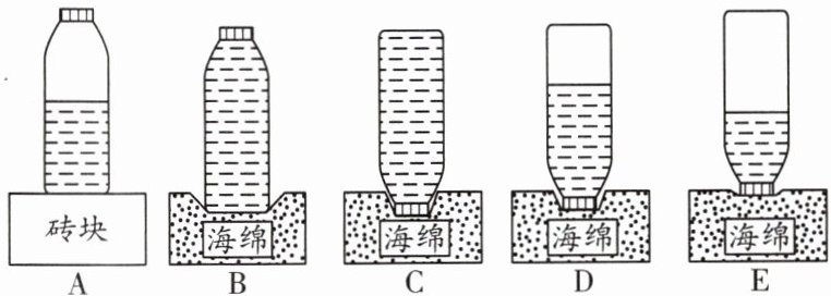 5. 如图所示,在“探究压力的作用效果与哪些因素有关”的实验中,小聪将废弃的矿泉水瓶装上水后分别放在海绵和砖块上进行实验。