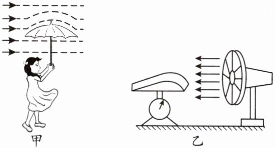 2. 如图甲所示,放学途中,小红撑着伞在雨中行走。一阵大风吹来,伞面被吹翻。她猜想伞面受到升力的大小可能与空气的流速有关,于是设计了如图乙所示的实验进行验证。