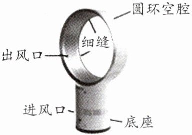 1. 如图所示是一款新型无叶电风扇,工作时,底座中的电动机将空气从进风口吸入,吸入的空气经压缩后进入环形空腔,再从环形空腔上的缝隙高速吹出,夹带周边的空气一起向前流动,导致环形空腔正面风速远大于背面风速。风扇正常运行时,环形空腔正面气体压强