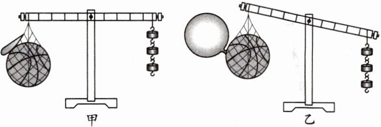 4. 如图甲所示,在杆一端挂一个打足气的篮球和一个带气球的打气针,另一端用一些砝码配重,使杆水平平衡。将打气针插入篮球的气孔内,气球因为充气而膨胀,可以看到杆失去平衡(如图乙所示)。在这一过程中,气球、篮球及球中气体的质量