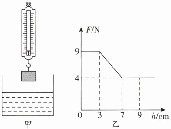 4. (双选)如图甲所示,用弹簧测力计竖直拉着一长方体实心物体,将物块从盛水的烧杯上方缓慢下降直至完全浸没水中,物块下降过程中,弹簧测力计的示数$F随物块下降高度h$的变化关系如图乙所示,下列说法正确的是($\rho_{水}= 1.0×10^{3}kg/m^{3}$)(