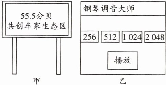 8. (2023·随州)如图是生活中的两个情境,图甲是居民小区噪声监测器,显示环境噪声为 55.5 分贝,图乙是钢琴调音师正在用手机上的一个调音软件播放音叉 256、512、1 024、2 048(Hz)的标准音来校准琴音。下列说法正确的是(