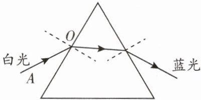 6. 如图所示,AO是从空气中斜射到三棱镜表面的一束白光,经三棱镜折射后发生色散。其中,射入空气中的蓝光光线已在图中画出,请你画出色散过程中黄光发生折射的大致光路。