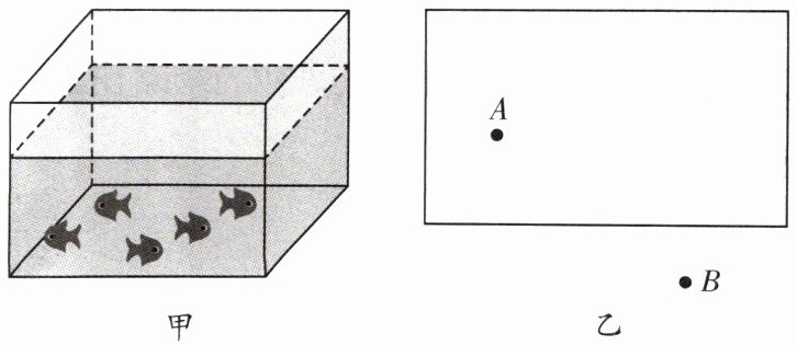 6. 如图甲是小明家的鱼缸,鱼缸左侧的玻璃上有一条鱼的像。图乙是其简化图, $ A $ 为鱼缸中实际的鱼, $ B $ 为小明眼睛的位置。请你在乙图中画出:
