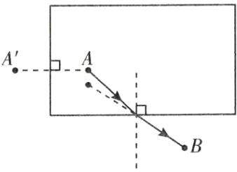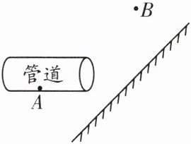 5. 如图所示,管道内 $ A $ 处有一只正在发光的小灯泡,小潘的眼睛在 $ B $ 处看到了平面镜中小灯泡的像,请画出小潘看到小灯泡 $ A $ 的像的光路图。