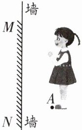 4. 竖直的墙面上有一块平面镜 $ MN $,小女孩站在平面镜前,她的脚前有一枚硬币(如图中点 $ A $ 所示),请你利用平面镜成像的特点画出小女孩看到硬币的像的光路图。