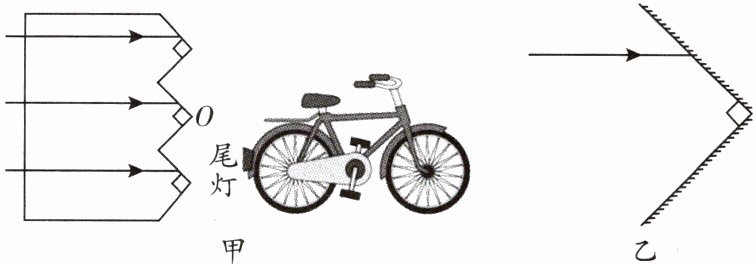 2. 自行车尾灯在夜晚当有光照射它的时候会很亮,但是它本身不发光。自行车尾灯是由互为直角的一些小平面镜组成的,如图甲所示,请在乙图中作图说明自行车尾灯反射灯光的过程。