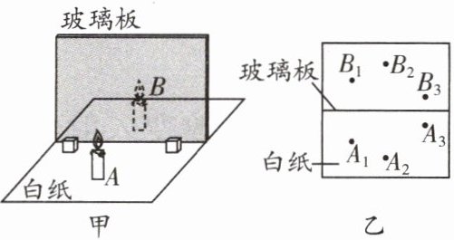 关系。(2) 将点燃的蜡烛 $ A $ 放在玻璃板前,移动玻璃板后的蜡烛 $ B $ 直至与蜡烛 $ A $ 的像完全重合,记录蜡烛 $ A $、蜡烛 $ B $ 的位置。改变蜡烛 $ A $ 的位置,重复上述实验,实验记录如图乙所示。蜡烛 $ A $ 位于 $ A_2 $ 位置时的像在