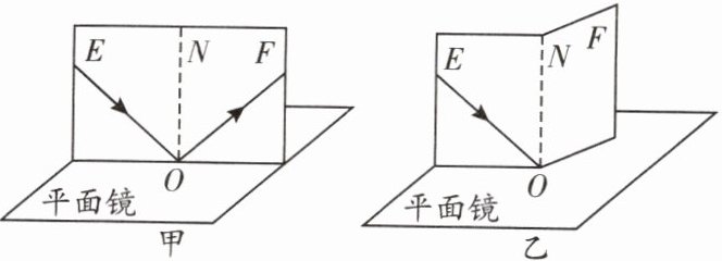 ,并记录下来。(3) 在图甲实验的基础上,以 $ ON $ 为轴,把纸板 $ NOF $ 向后折,在纸板上看不到反射光,如图乙所示,这表明:在反射现象中,反射光线、入射光线和法线在