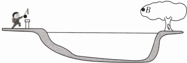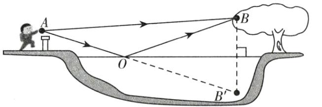 7. (2025·长沙) 傍晚时分,在水面平静的池塘边,小湘尝试用激光笔从 $ A $ 点去照亮池塘对面树上的一个果子($ B $ 点),发现可以用两种不同的方式实现。请在图中画出这两种方式的光路图(保留作图痕迹)。