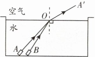 8. (2024·河南) 如图,观光水池中,一束红光沿 $ AO $ 方向从水射入空气,折射光线为 $ OA' $。若另一束红光沿 $ BO $ 方向从水射入空气,请大致画出入射光线 $ BO $ 的折射光线,并标出对应的折射角 $ r $。