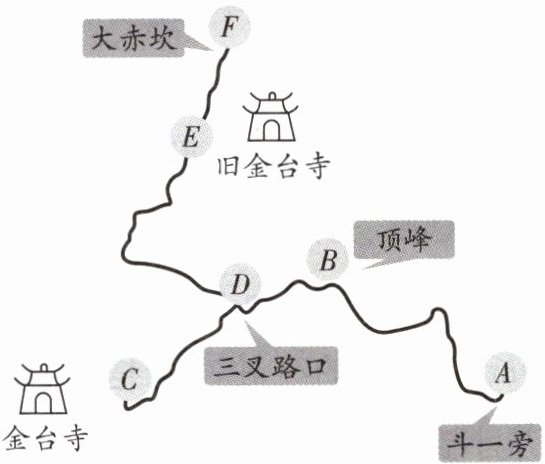 6. 黄杨山屹立于珠海市境内,程程、庆庆两家人相约去爬黄杨山。他们上网查找了相应的路线攻略。如图,他们准备从不同路线登山,最终在顶峰$B$点汇合。